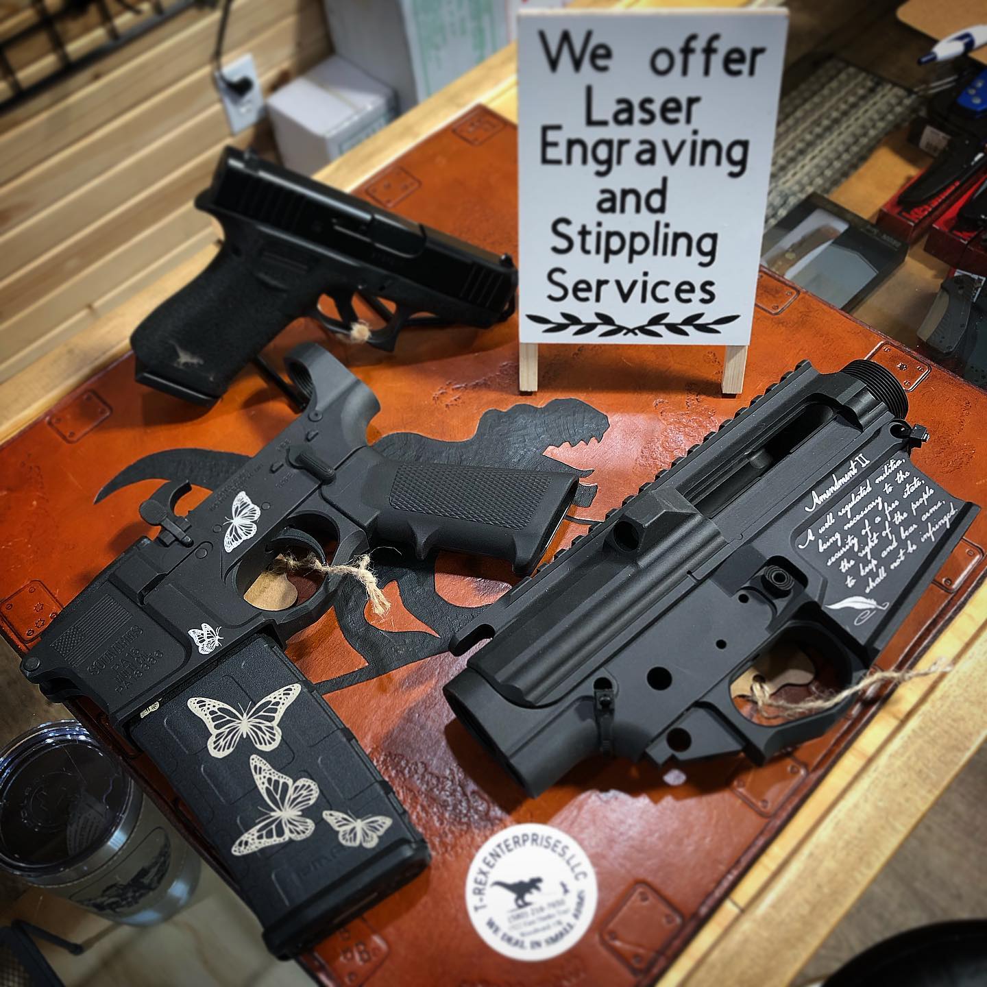 Have a firearm or other product and want to add a little personality to it? We also do laser engraving! Come talk to us and let’s figure out a design. We can customize firearms, cups, plaques, and so much more! Your imagination really is the limit.